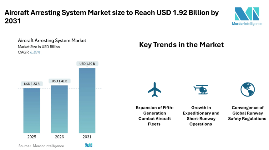 According to Mordor Intelligence, the aircraft arresting system market size was valued at USD 1.41 billion in 2026 and reach USD 1.92 billion by 2031, registering a CAGR of 6.35% during the forecast period. The aircraft arresting system market size is supported by rising investments in advanced fighter aircraft, aircraft carrier modernization programs, and stricter runway safety requirements across commercial airports.
