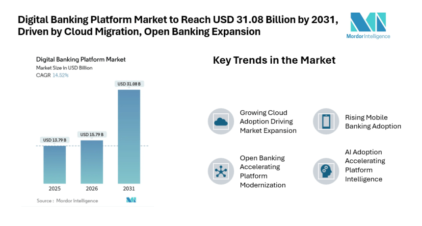 According to Mordor Intelligence, the digital banking platform market size was valued at USD 13.79 billion in 2025 and is estimated to reach USD 15.79 billion in 2026, advancing toward USD 31.08 billion by 2031 at a CAGR of 14.52% during the forecast period. This steady rise reflects the growing importance of digital infrastructure as financial institutions modernize their technology foundations to deliver seamless, real-time services across retail and corporate banking environments. The digital banking platform market growth is supported by increasing migration from legacy banking systems to flexible digital platforms.