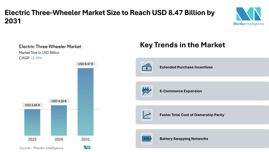 Reading: Electric Three-Wheeler Market Size to Reach USD 8.47 Billion by 2031, Amid Expanding Fleet Demand and Battery Swapping Adoption- Mordor Intelligence