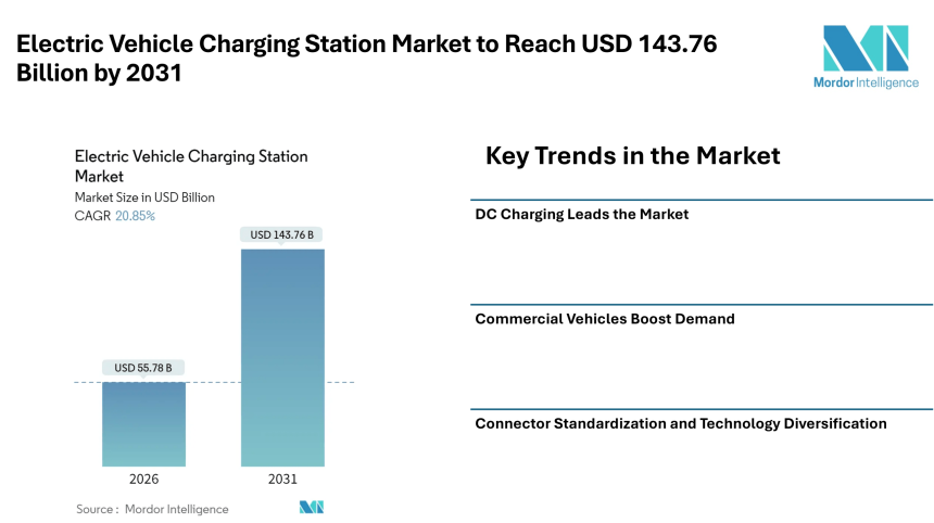 The global Electric Vehicle Charging Station market size is on a strong growth trajectory as the adoption of electric vehicles accelerates worldwide. According to Mordor Intelligence, the market was valued at approximately USD 55.78 billion in 2026 and is expected to expand to around USD 143.76 billion by 2031, growing at a robust CAGR during the forecast period. This expansion reflects growing demand for reliable charging infrastructure, advancing battery technologies, supportive government policies, and investments in both public and private charging networks.