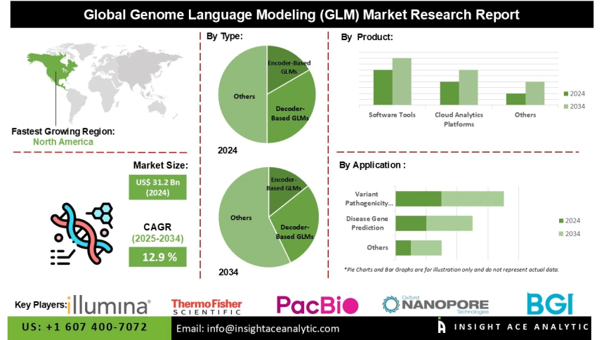 InsightAce Analytic Pvt. Ltd. announces the release of a market assessment report on the “Global Genome Language Modeling (GLM) Market Size, Share & Trends Analysis Report, By Type (Encoder-Based GLMs, Decoder-Based GLMs, and Hybrid/Multimodal GLMs), By Application (Disease Gene Prediction, Variant Pathogenicity Assessment, Functional Genomics Annotation, Clinical Diagnostics, Drug Discovery & Development, and Agricultural Genomics), By End User (Academic & Research Institutes, Pharmaceutical Companies, Hospitals, and Biotech Firms), By Product (Software Tools, Cloud Analytics Platforms, Custom Genomic Models),-Market Outlook And Industry Analysis 2034″