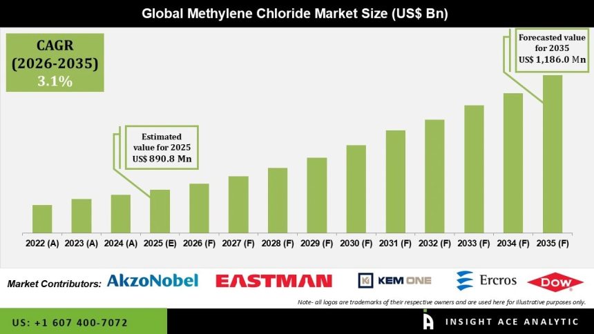 InsightAce Analytic Pvt. Ltd. announces the release of a market assessment report on the “Global Methylene Chloride Market Size, Share & Trends Analysis Report By Application (Metal Cleaning, Paint Remover, Solvent, Foam Manufacturing, Pharmaceuticals, Chemical Processing, and Others), End-user (Pharmaceuticals Industry, Food & Beverage Industry, Transportation Industry, Building & Construction Industry, Others), Distribution Channel (Direct and In Direct),-Market Outlook And Industry Analysis 2035″